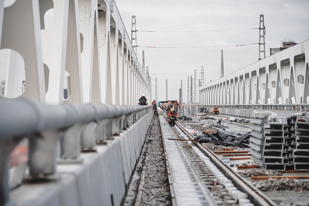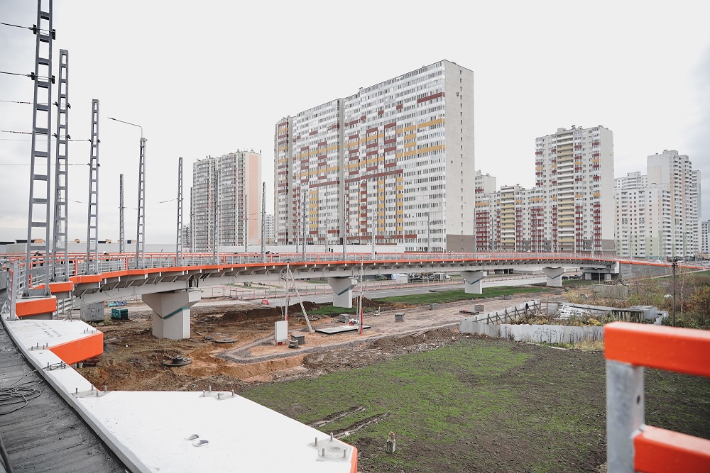 Проведенный анализ показывает, что нагрузка на прилегающие магистрали снизится как минимум на десять процентов. Трамваи будут курсировать по выделенной линии, которая частично пройдет над землей: маршрут включает семь надземных сооружений, самое масштабное из которых - путепровод через КАД, железную дорогу и Московское шоссе. Его общая длина составляет 1,2 километра, из них 240 метров приходится на пролетное строение над КАД. Грандиозную конструкцию из 24 секций поддерживают 25 опор, высота которых доходит до 13 метров - это примерно на треть больше общепринятого. Ровно год назад, в ноябре прошлого года, Александр Беглов дал старт ее надвижке, а сейчас здесь идут финальные работы - монтаж контактной сети, заливка бетоном деформационных швов, окраска перил и барьеров, укладка асфальтобетонного покрытия. На стройке одновременно трудятся более 500 рабочих и около 120 единиц техники. Все должно быть завершено до 25 ноября, но параллельно с завершением первого этапа магистрали сооружаются объекты второго этапа - от депо до микрорайона "Славянка".