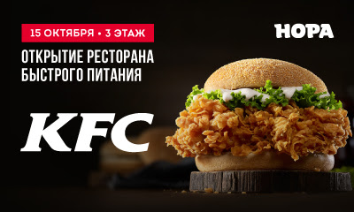 15 октября в 18:00 в торгово-развлекательном центре «Нора» состоится открытие ресторана общественного питания KFC! Приглашаем всех фанатов острых крылышек на торжественное открытие любимого бренда.